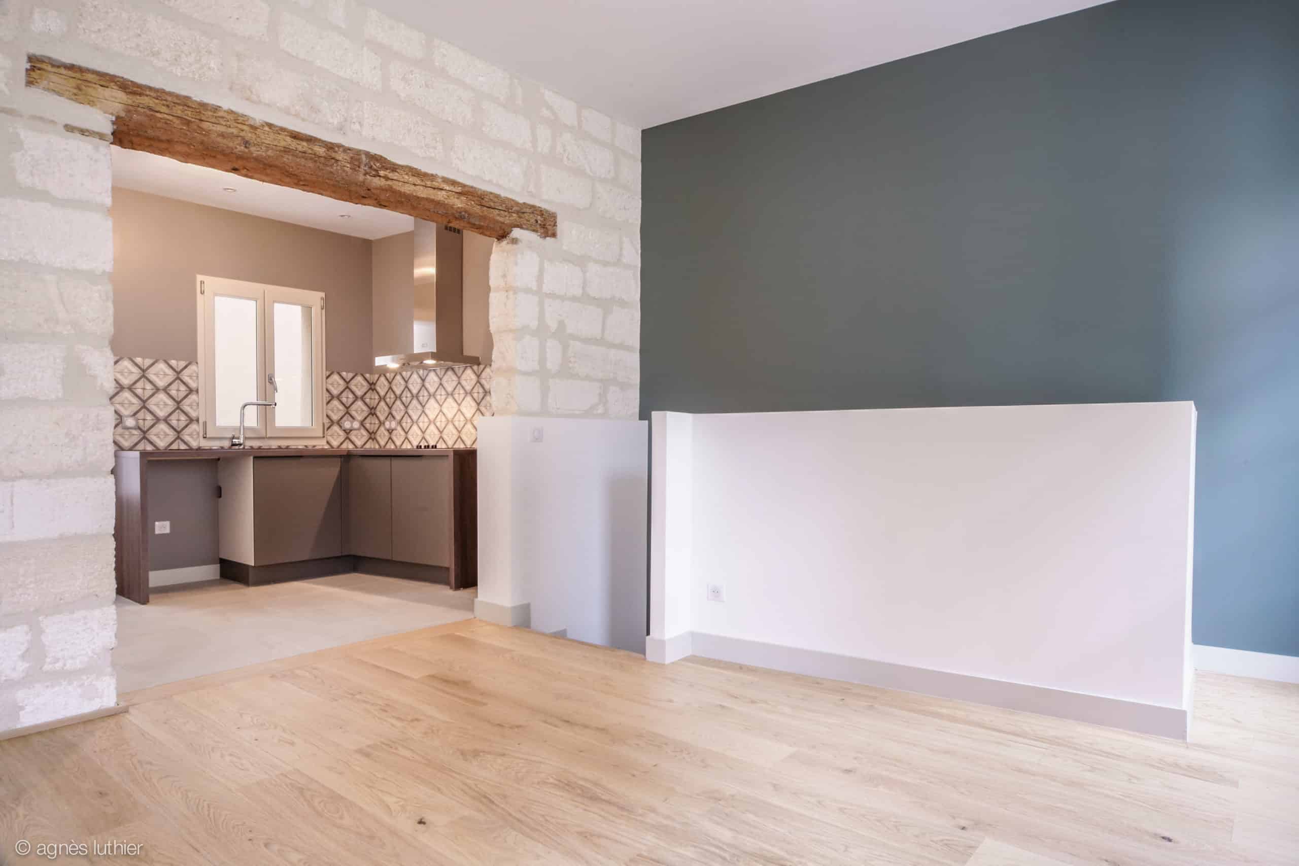 Valorisation du caractère ancien de l’immeuble en conservant les murs en pierre partiellement.