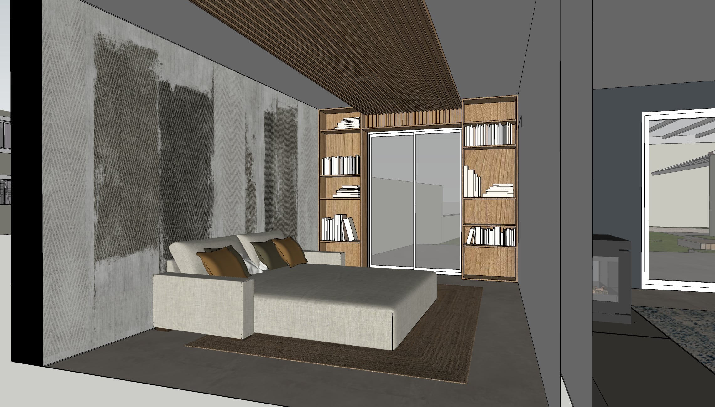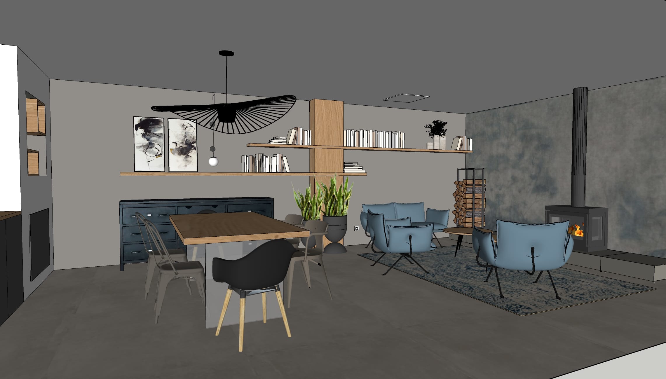 Travaux en cours ….3D ….Valoriser la relation au jardin avec la création d’une grande ouverture de 4,50 m en galangage sur la terrasse, transformation du salon avec intégration d’un poêle à bois et d’un espace home cinéma avec bibliothèque attenant. Création de divers mobiliers sur-mesure pour optimisation des rangements. Création d’une belle chambre enfant sur-mesure et d’une salle de bains tout en fantaisie pour les filles.