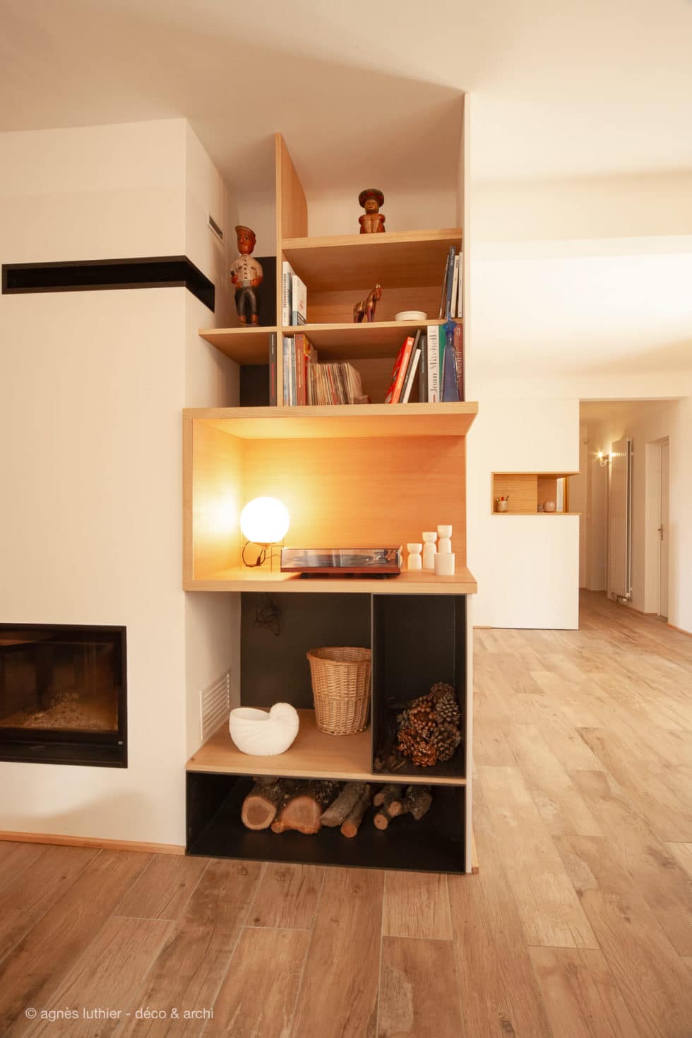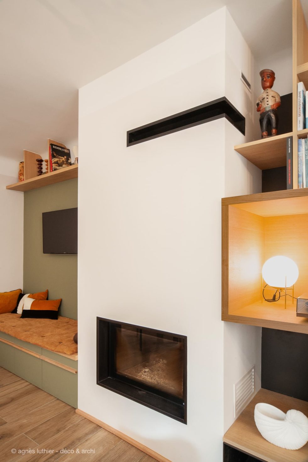 Ensemble sur-mesure agrandissant l'espace en valorisant le décor et paysage environnant.TV cachée, rétro-éclairage pour sublimer les rythmes verticaux, création d'une banquette, coin lecture près de la fenêtre, habillage de la hotte de la cheminée pour intégration...