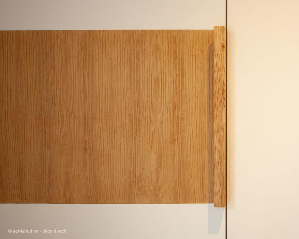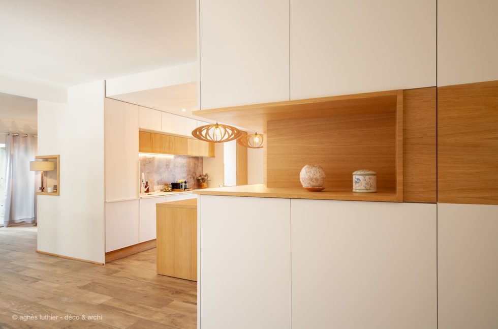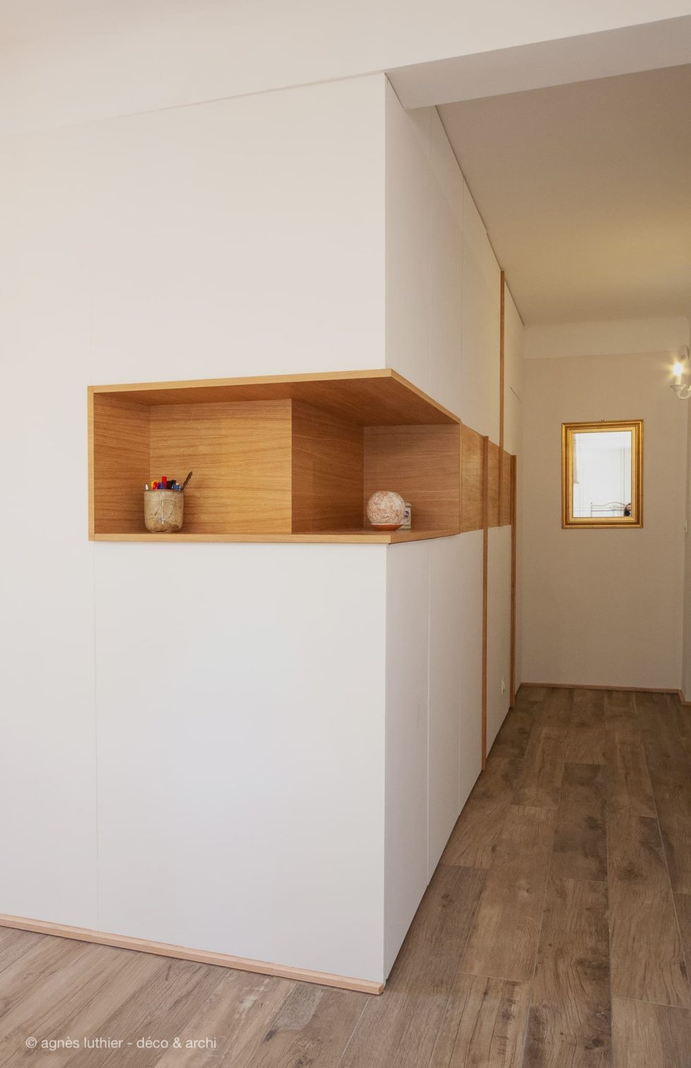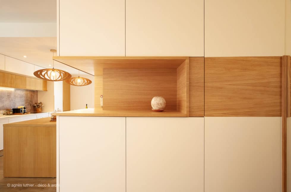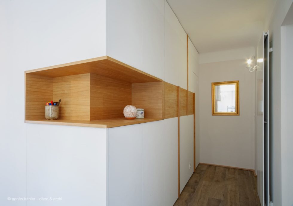 Création d’un deuxième volume pour un coin dressing dans l’entrée, avec divers rangements et niche ouverte.