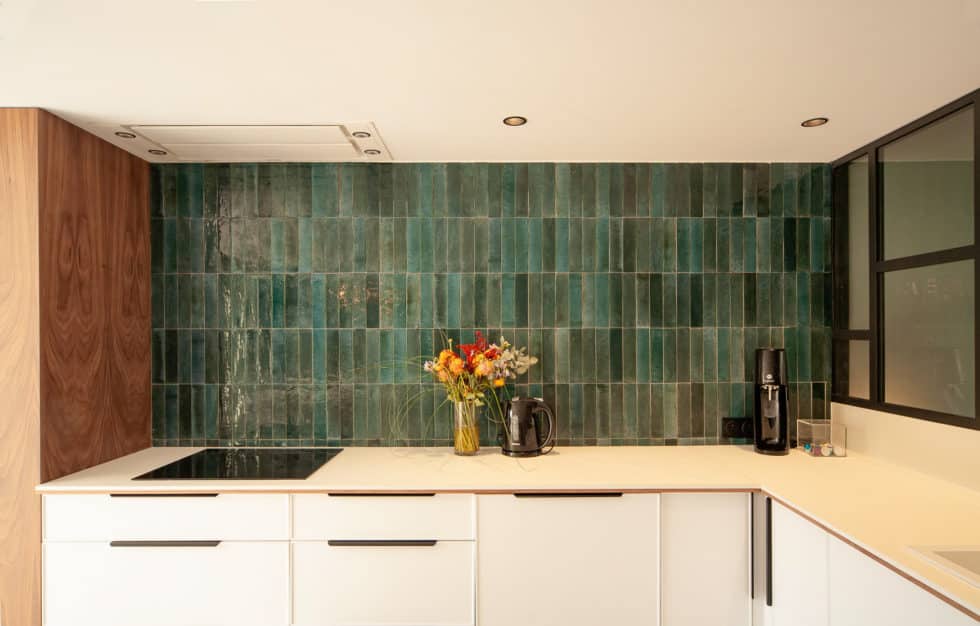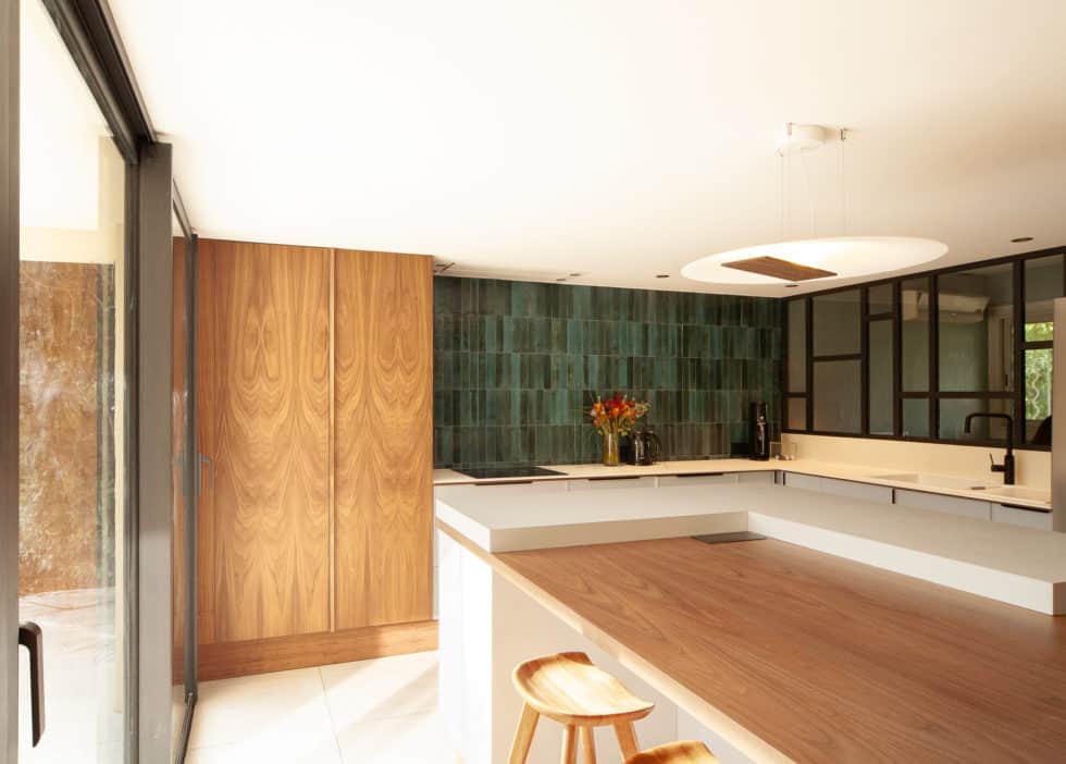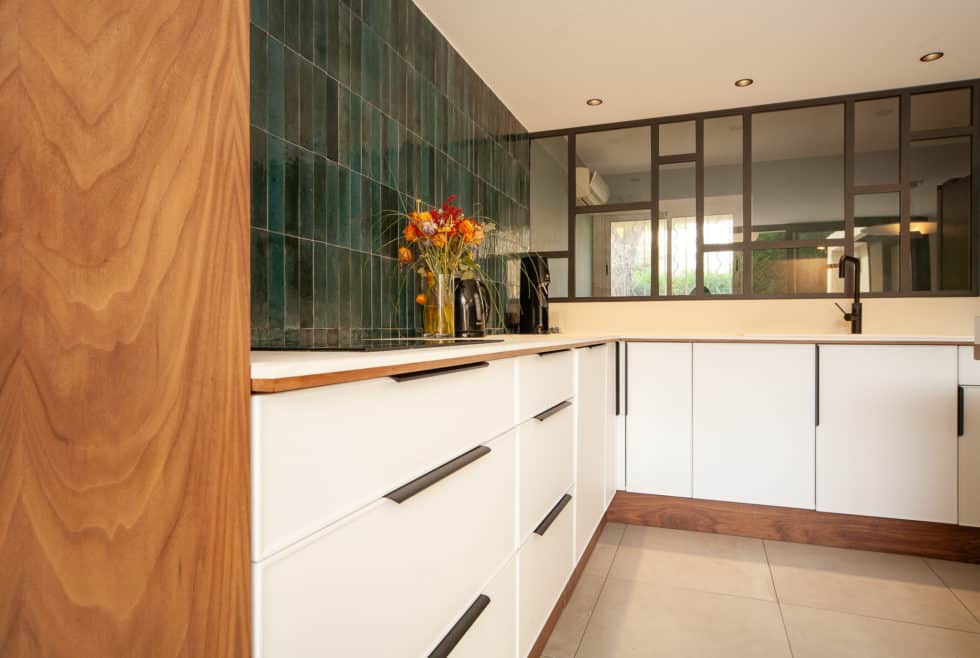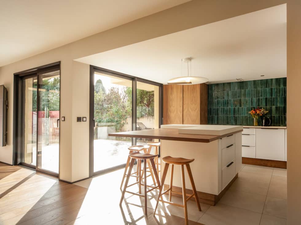 Création d’une cuisine généreuse ouverte sur la pièce à vivre et le bureau adjacent via sa verrière.