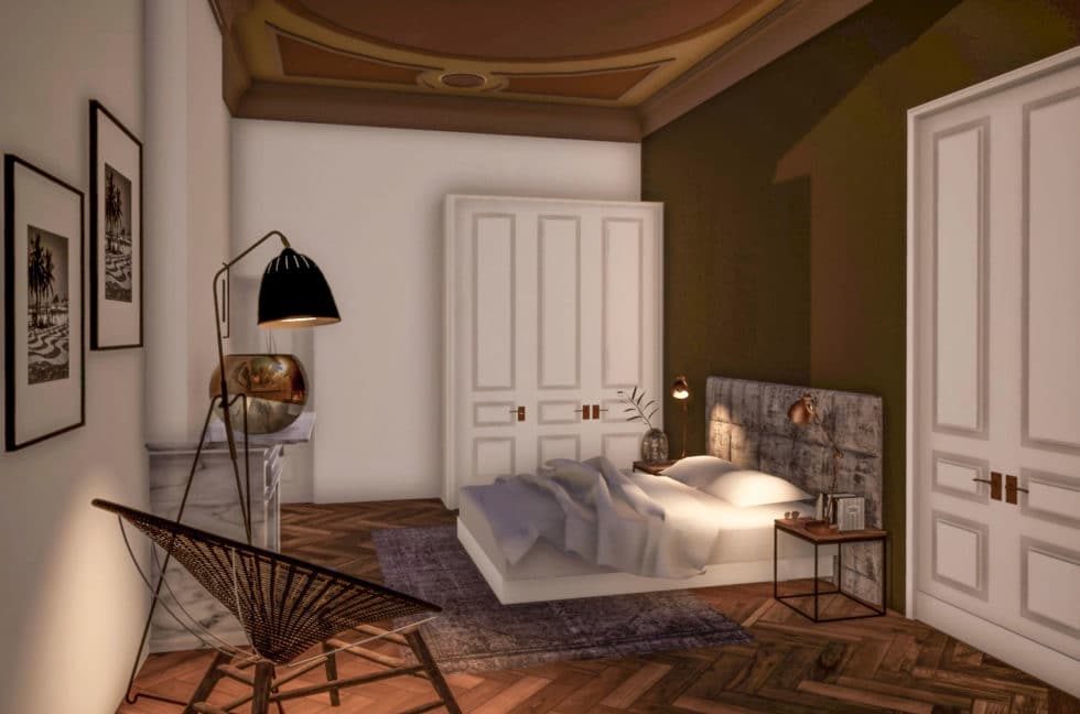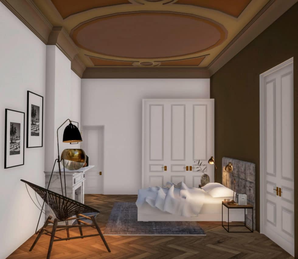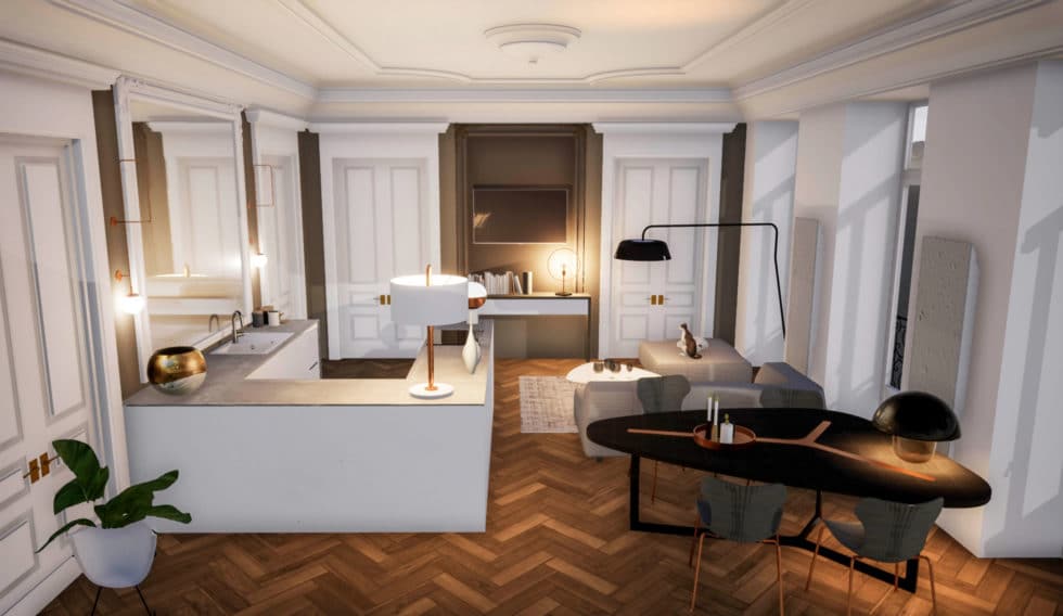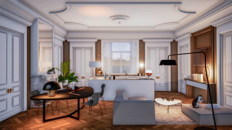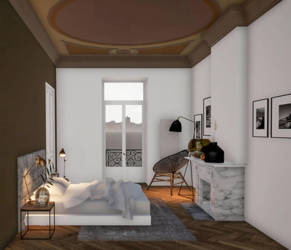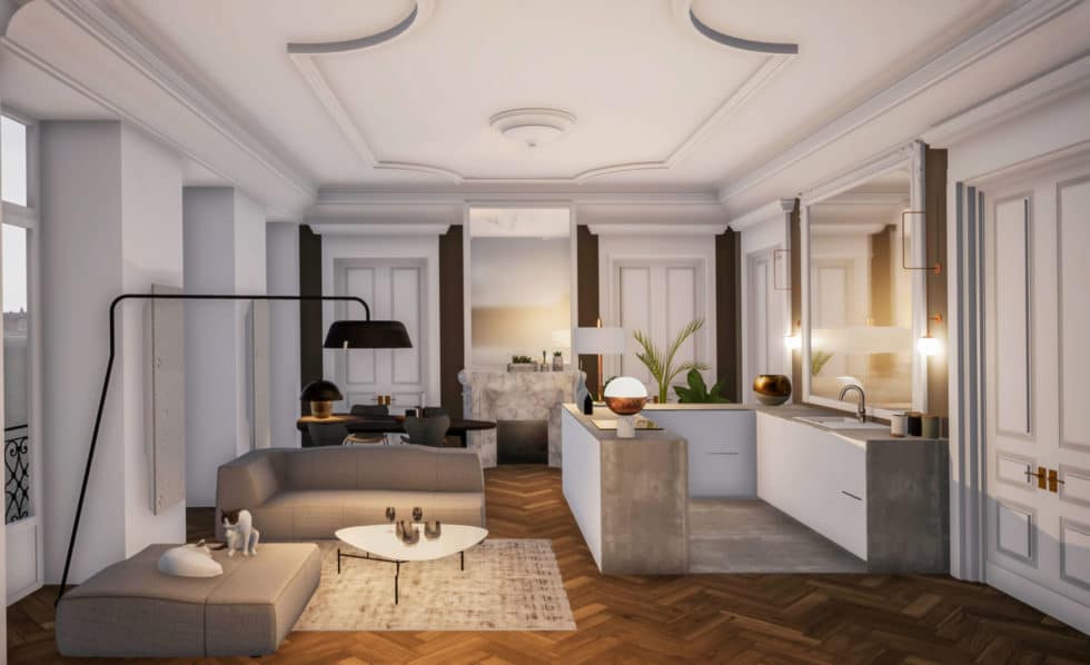 Des couleurs sourdes aux murs, égayées par l'utilisation choisie du laiton et du végétal, réveillent ce lieu ancien en passe de devenir un appartement cosy et confortable.Vues 3D pour patienter avant la réhabilitation complète de cet appartement....