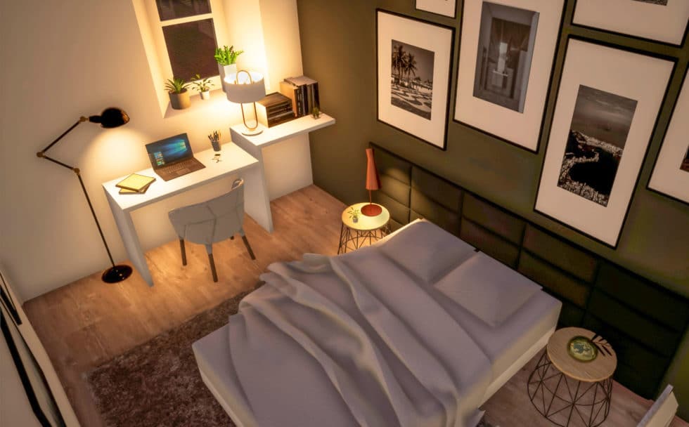 La chambre et la salle d’eau offrent une ambiance cosy et raffinée grâce au choix de matériaux nobles et intemporels.